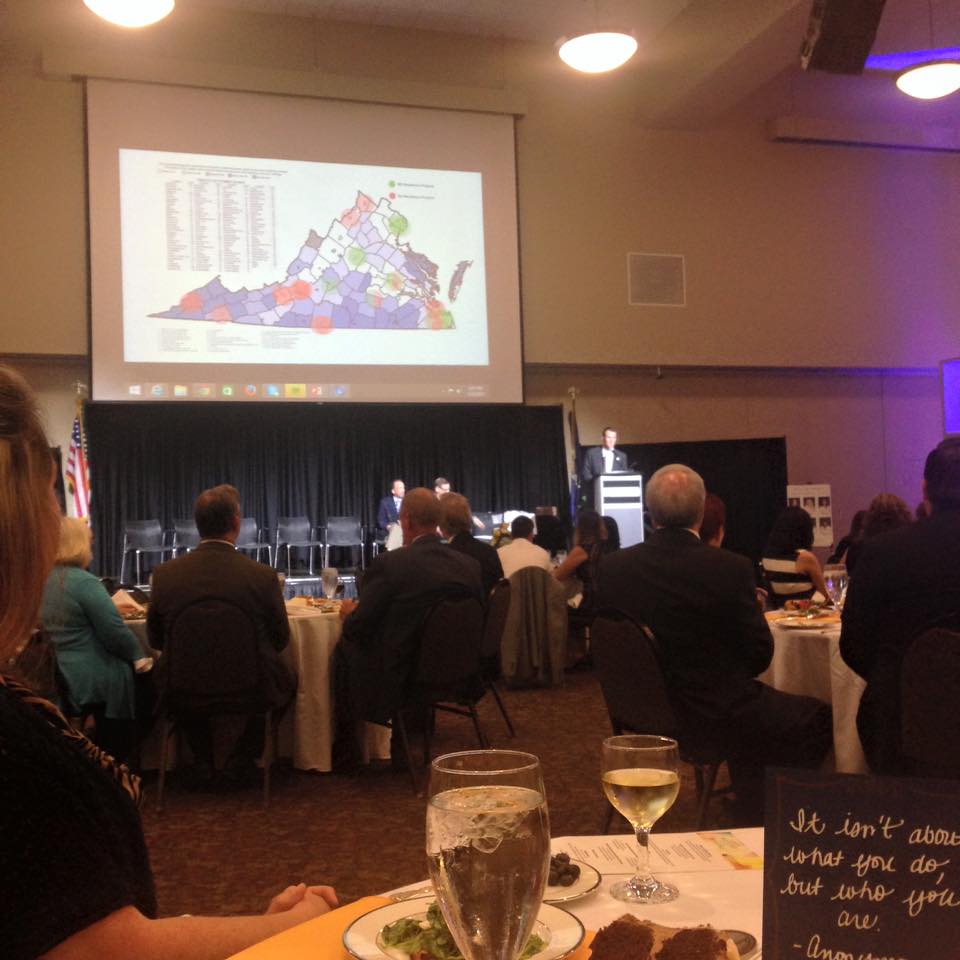 So what’s on that map? These are the Family Medicine, Internal Medicine and Pediatric residencies in Virginia (blue = MD, red = DO). The counties are color coded by their County Health Status ranking. Very light colors are the best rankings, dark green – the opposite.